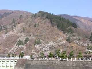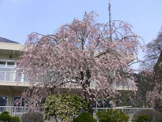 (今週末が満開だった ダムの周りの桜)_______(ダム管理棟の枝垂れ桜)