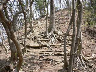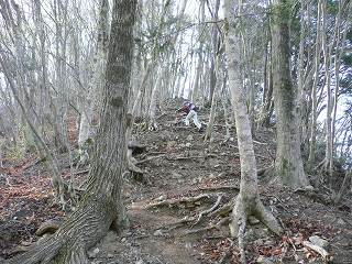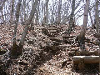 展望広場から急斜面を登りますが、登山道は木の根がガレ石を止めているで見た目より