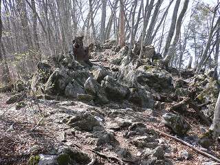 ___(登山道に出た石灰岩)__________(カタクリを撮影するグループ)
