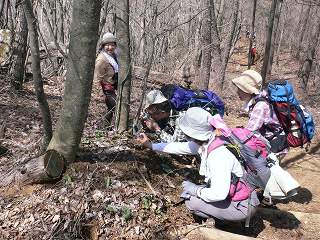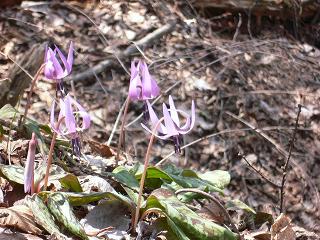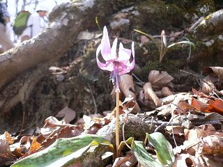 登ってヒノキ林から雑木林に変わった所で最初のカタクリを見ました。