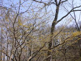 急斜面の上ではコバイケイソウが新芽を出して 頭上にはアブラチャンが咲いてました。