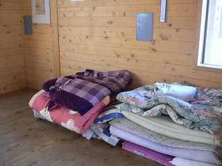 _(ログハウスタイプの避難小屋)__________(避難小屋の寝具)