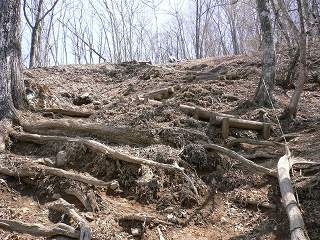 (丸太の階段が崩れてしまった登山道)_____(登山道の両脇に張られたトラロープ)