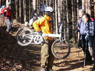 陣馬山の山頂の手前にある坂でマウンテンバイクを担いだ青年と行き会いました。