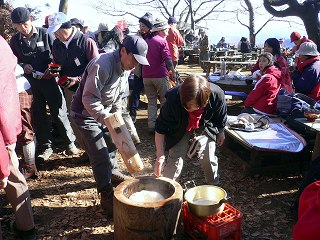 それぞれの店の広場で新年の餅つきハイクをしている団体がいましたが、臼とモチ米は