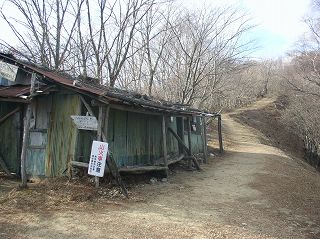 北峰から下りた鞍部に 今にも倒壊しそうな川乗小屋があって、ここで百尋の滝コースと