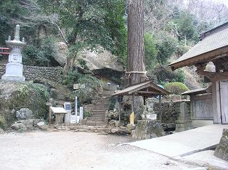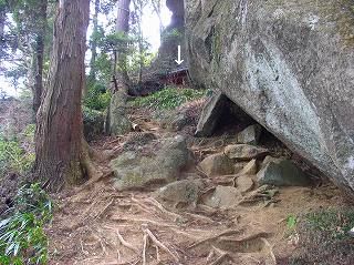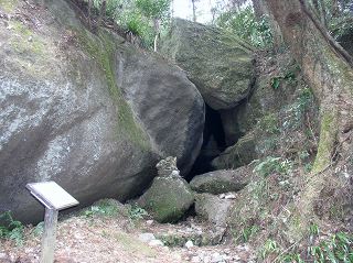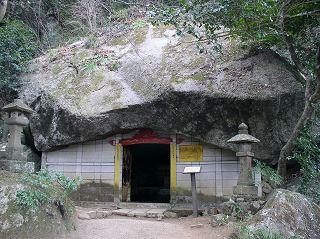 山門の左にある階段を登ると大きな岩の下に岩窟があります。