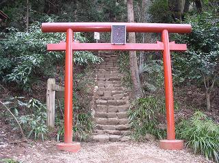 ______(赤い鳥居)_____________(登山道の上に奥の院(矢印))