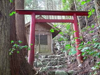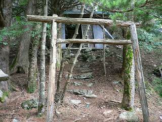 山頂から石尾根に向けて東に下りると、すぐ下に腐りかけた鳥居と寂れた神社があります。