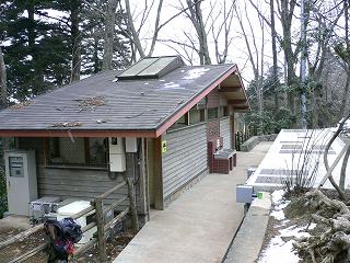 山頂から薬王院側に下りた所に公衆トイレがあって、その先の日陰では ストックも持たずに