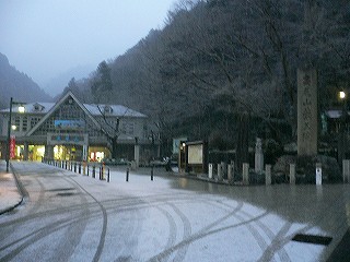 食事を終えてから表に出ると 薬王院辺りからパラつき始めた雪が辺りを白く染めてました。