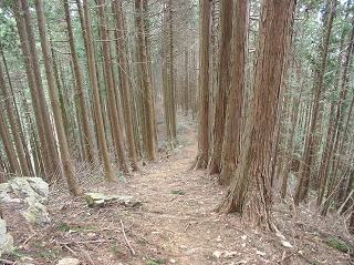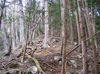 杉林の中の登山道は傾斜がきついうえに木の根と石が出てました。