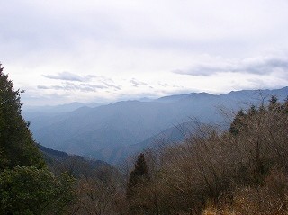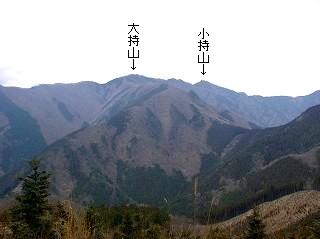 ___(ヒノキ林の中の登山道)_________(登山道から見た大持山と子持山)