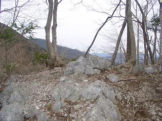 腰を下ろしやすい岩の上で登山道に石灰岩が多くなると、その上に天狗岩があります。