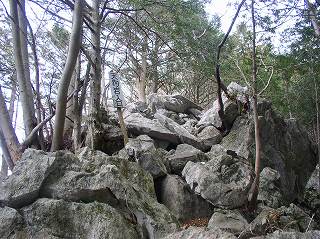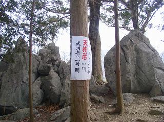 _(画像の中央に天狗岩入り口の札)________(天狗岩の上にある案内)
