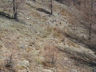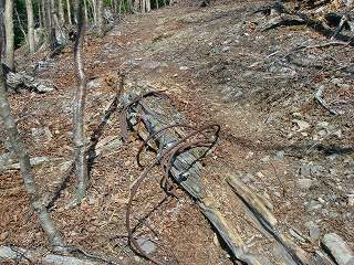 川又の分岐から15分登った所にある二瀬分岐から右に行って焼け跡の斜面を下ります。