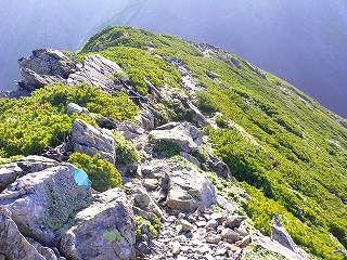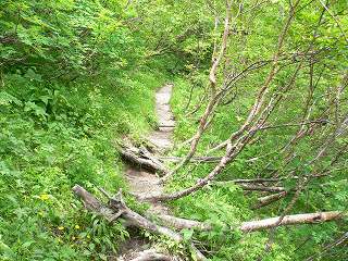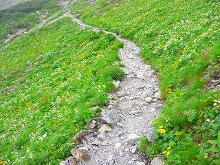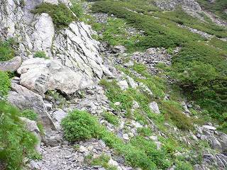 登山道は赤石岳の西側に位置しているので陽射しが遮られて涼しかったが、登山道の