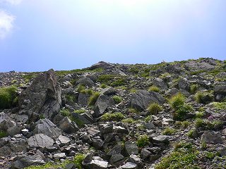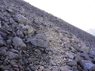 __(無数の石が転がる登山道)________(画像の7時の位置が 登山道の踏み跡)