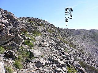 登山道の先に赤石岳避難小屋が見えます。