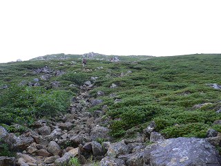 馬ノ背の先で無数の石が転がる登山道を登りますが 最初は傾斜が緩くて歩き易く、この