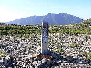 _(赤石岳の標柱、後ろは荒川三山)_____(雲の上にある富士山が分かるかな・・)