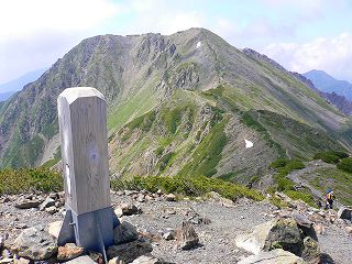 ___(東尾根分岐に立つ道標)__________(小赤石岳から見た赤石岳)