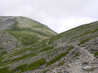 __(小赤石岳北斜面の登山道)___________(下から見上げた北斜面)