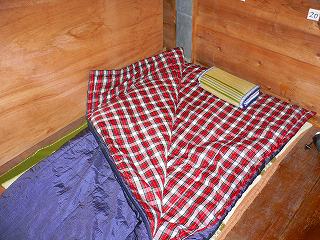 ___(中岳避難小屋の寝床)_________(ゆったりしたシュラフタイプの寝具)