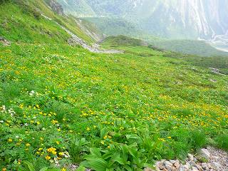 (登山道の上に咲くハクサンイチゲ)________(谷側に咲くシナノキンバイ)