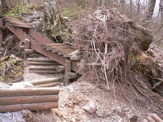 ___(五合目の手前の登山道)___________(根こそぎ倒れた大木)