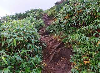 _____(赤土の登山道)_____________(笹と木の根の登山道)