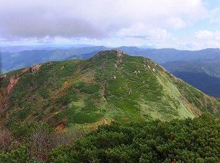 爼ーからハイマツの中の傾斜のきつい登山道を5分下りて、そこから10分登り返して