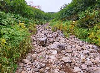 やがて大きな岩がある登山道の上で 谷あいに石が転がるガレ場を登ります。