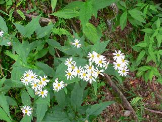 (防火帯に咲くマルバダケブキ、右上が登山道)| 雲取山(くもとりやま) 東京都・埼玉県・山梨県 / 2017m 2005年8月20〜21日 晴れのち曇り 2000年9月09〜10日 晴れのち曇り (奥多摩、小袖乗越コース) |