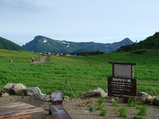 _(黒部五郎小舎から見た薬師岳)_________(テン場の右奥に笠ヶ岳)