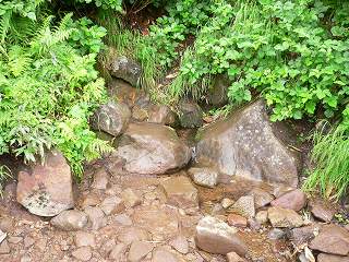 銀嶺水から15分登った所にも少し広くなった所があって、そこから岩が散乱する斜面を