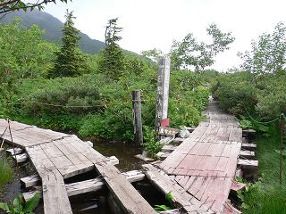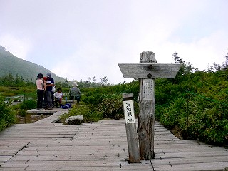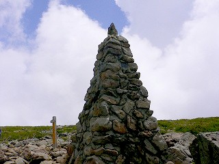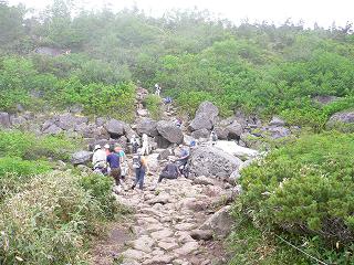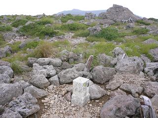 岩が転がる登山道を40分登った所で森林限界を超えると その上の台地に岩に付けられた