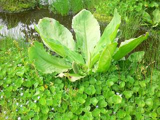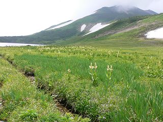 地塘の周りにはウメバチソウやチングルマなどが咲いて、仏焔包が落ちたミズバショウは
