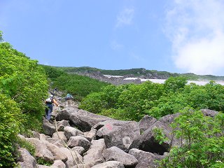 白馬大池山荘に向けて大きな安山岩の中の登山道を下りて行きます。