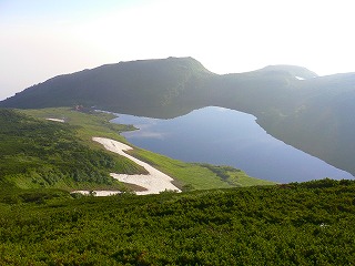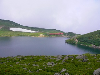 乗鞍岳頂上からハイマツ帯の中を歩いて行くと 突然 眼下に白馬大池が現れて、そこから