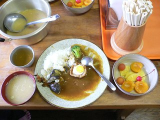 夕飯はカレーライスで ご飯とカレーと味噌汁がおかわり自由です。