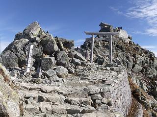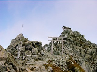 大汝山から15分歩いて着いた雄山には信仰の山らしい碑と社務所があって、天に突き出た