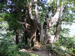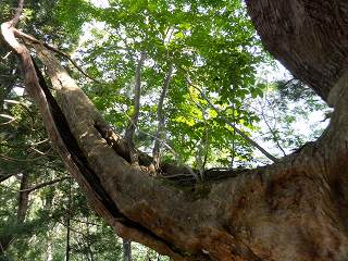 __(中が空洞になった一服杉)__________(一服杉の枝に生えた若木)