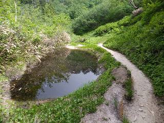 ___(登山道の横にある池)________(旧道の入り口に張られたトラロープ)