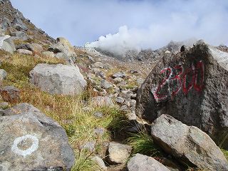 (登山道の岩に付いたペンキ印)