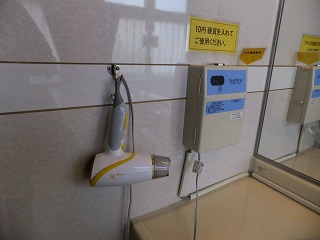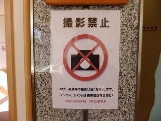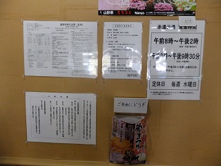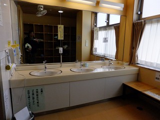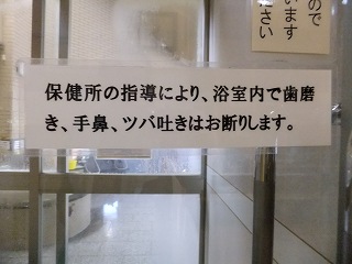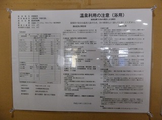 玄関を入ると左に靴箱がありますが、(山形県は雪が多いようで)今回利用した温泉施設では どこでも 靴箱の中に水漏れ防止の為のステンレス製の箱が入ってました。 (金属製の箱が入った靴箱)中に入ったら 券売機で購入した入浴券を受付に出します。 ![]() _______(券売機)__________________(受付) 受付の左奥に待合席があって、右奥に 2階の浴室に行く 階段とエレベーターがあります。 ![]() _______(待合席)____________(浴室に行く階段とエレベーター) ロビーにある温泉分析書によると 源泉名は 森の山源泉・森の山2号源泉、泉質は 含硫黄 -ナトリウム・カルシウム-塩化物温泉で、温泉表示によると すべてかけ流し(放流式)にで、 上がり湯(掛け湯)の湯栓とシャワーにも源泉が使われていて、泉温が高いために水道水で 温度調節をしていて、毎日 完全換水して清掃しているとのことです。 ![]() _(温泉分析書・温泉表示・営業時間)__________(温泉分析書) エレベーターから出た所にイスがあって、その奥に 浴室の入り口があります。 ![]() ____(物置台を備えたイス)_________(浴室の入り口に掛かる湯のれん) 施設は新しくて脱衣所もキレイです。 ![]() ____(洗面ドレッシング)____________(1回10円のドライヤー) トイレもキレイで 100円リターン式の貴重品ロッカーもあります。 (トイレと貴重品ロッカー)ここから先は撮影禁止でした、・・残念。 (撮影禁止の注意書き)というわけで 浴室内で気付いた事を書いておきます。 2重になったドアを開けて浴室に入ると 縁に黒御影石が使われた半月型の掛け湯があります。 左の斜めになった壁にある6つの洗い場には(共同浴場なので)ソープ類の備品はありません。 洗い場の周辺に細々とした注意書きがあって、今回利用した山形県の温泉の多くが 浴室内 での歯磨きが禁止でした。 (浴室の入り口にある注意書き)右側にある浴槽は 縁に黒御影石が使われた四角いタイル張りで、2つに分かれた浴槽は 手前が4人が入れる あつ湯で、奥が 8人が入れる ぬる湯ですが、温度に それほどの差は ありません。 手前のあつ湯には湯の花が浮遊してましたが、奥の浴槽には湯の花がありませんでした。 2つの浴槽の間にある岩の湯口の両方から温泉が出ていますが、あつ湯の量が少なかった のに対して ぬる湯は(加水しているのか)大量に投入されてます。 温泉は掛け流しで、浴槽からあふれた温泉は排水溝に流れ込んでます。 温泉は無色透明で 硫化水素臭にわずかな塩味がしますが、肌触りには特徴を感じません。