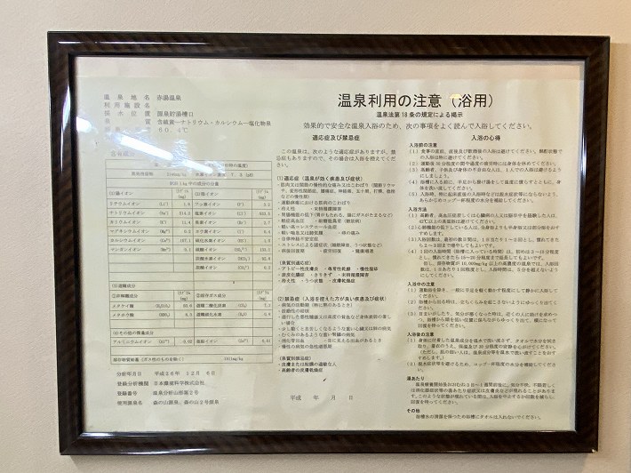 脱衣所にある温泉分析書によると源泉名は赤湯温泉で 泉質は