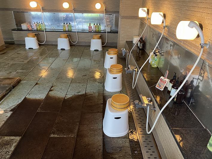 浴室の床には十和田石が使われているが 温泉由来成分で部分的に