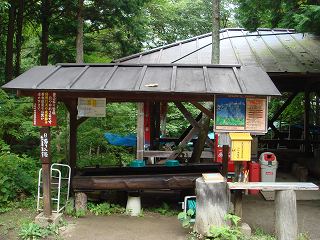 広い庭には水場と自販機と登山者ポストがあって、向かいに 木のテーブルが並んでいます。