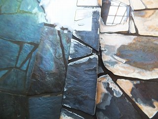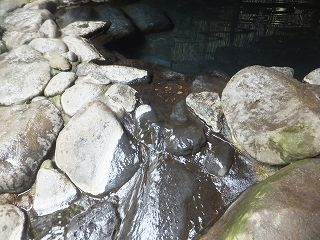 石板の浴槽は 温泉に濡れた所が青みがかってギラギラして見えます。